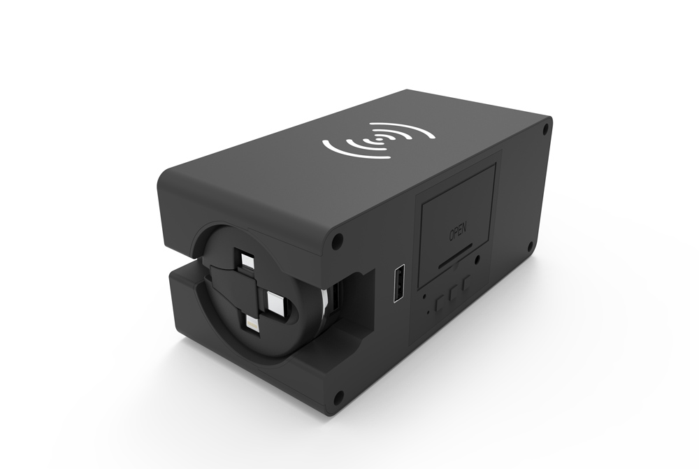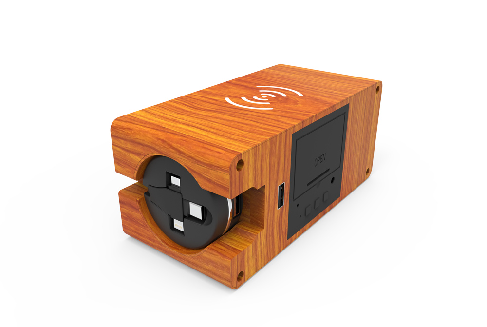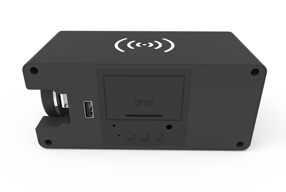 伸缩线长度:800mm材质:ABS功能:可展示时间、温度(-10°到55°),还可设置三个闹钟,无线充电(5W)输入:DC5V/2A输出:5V/8A