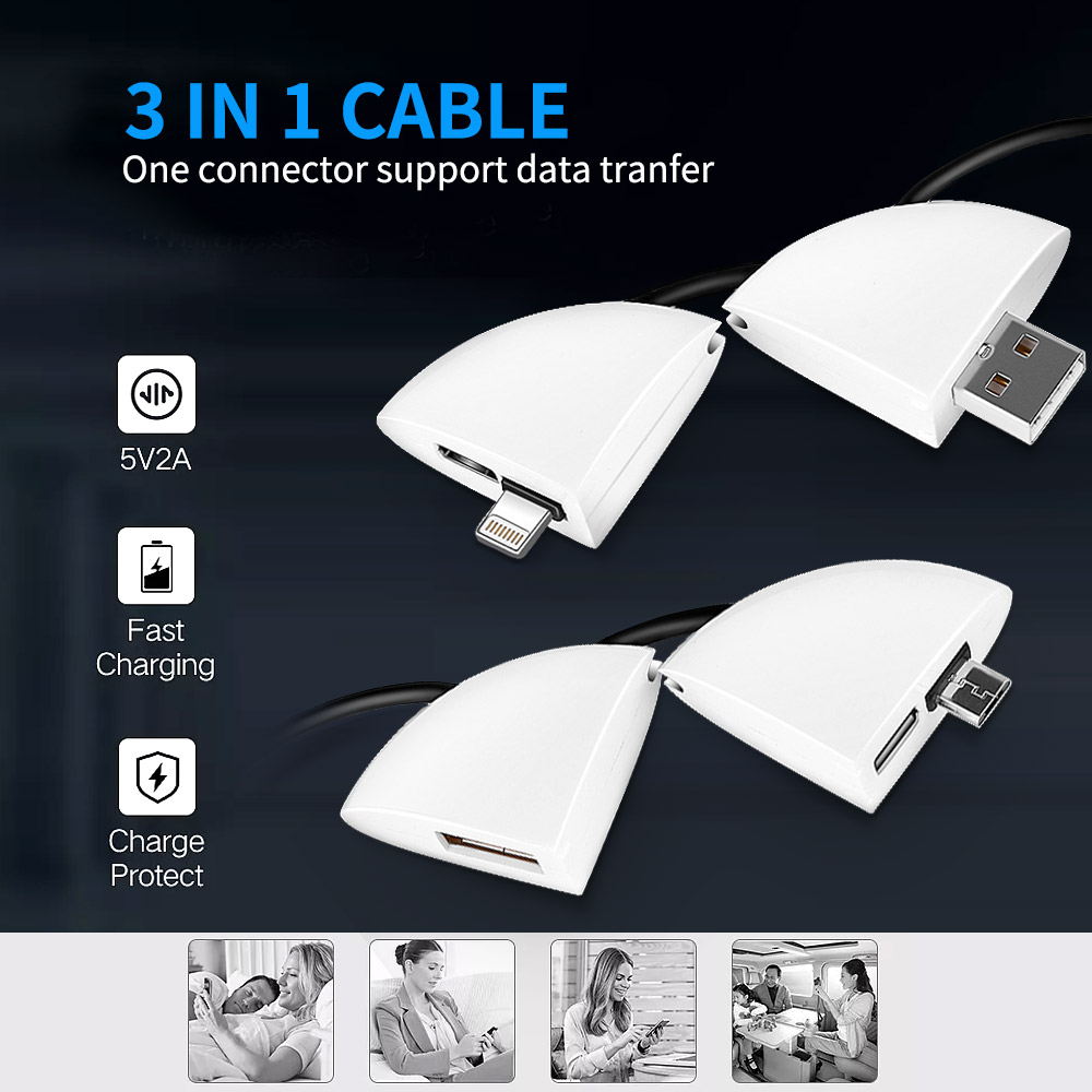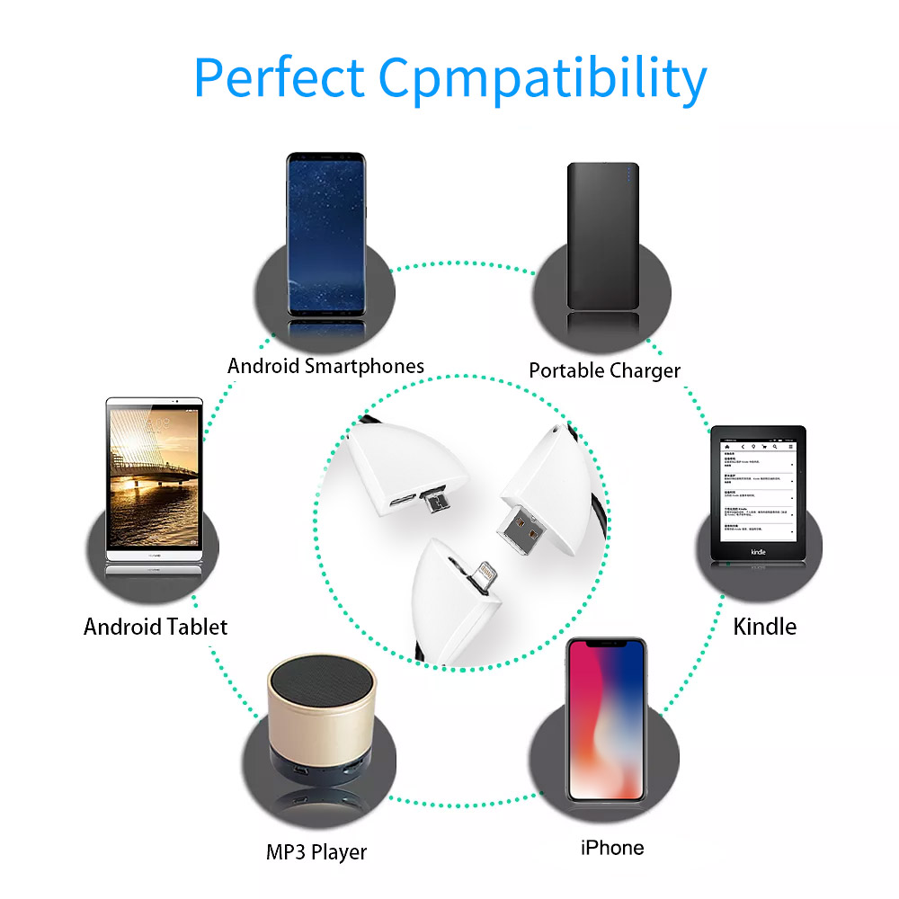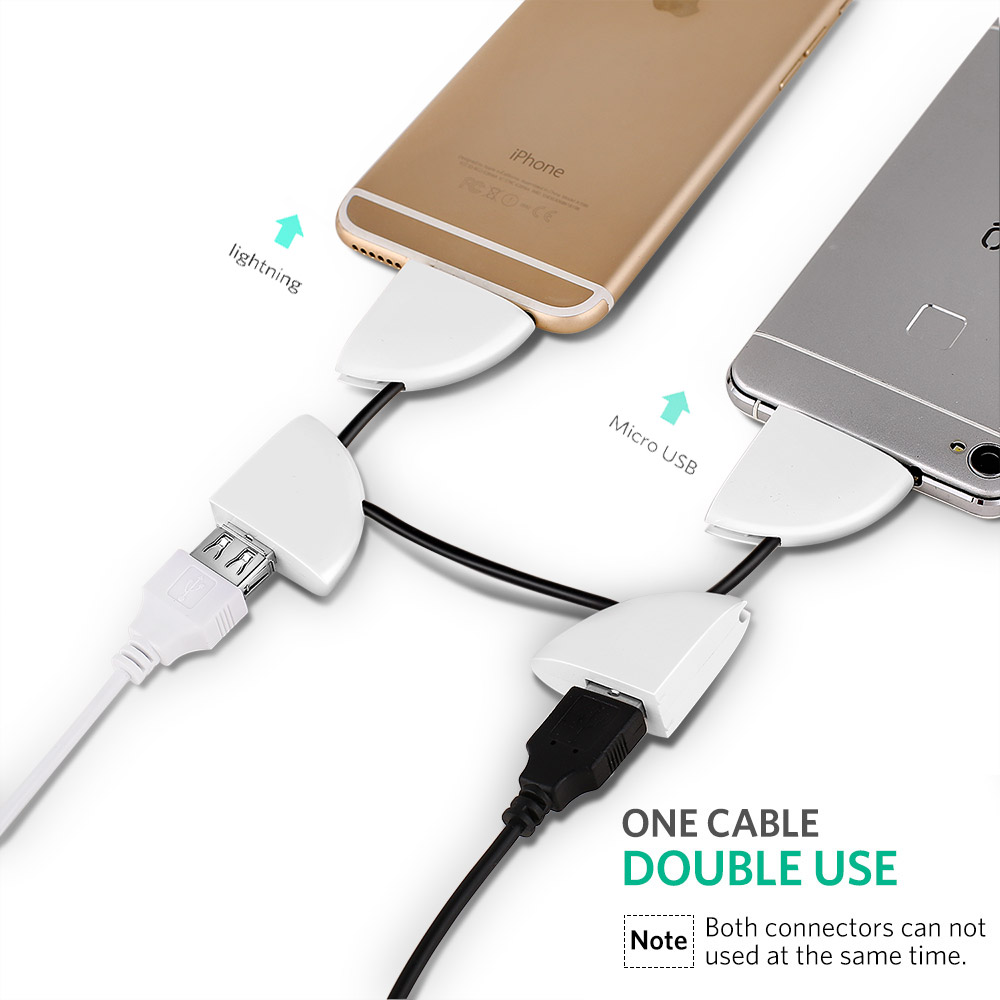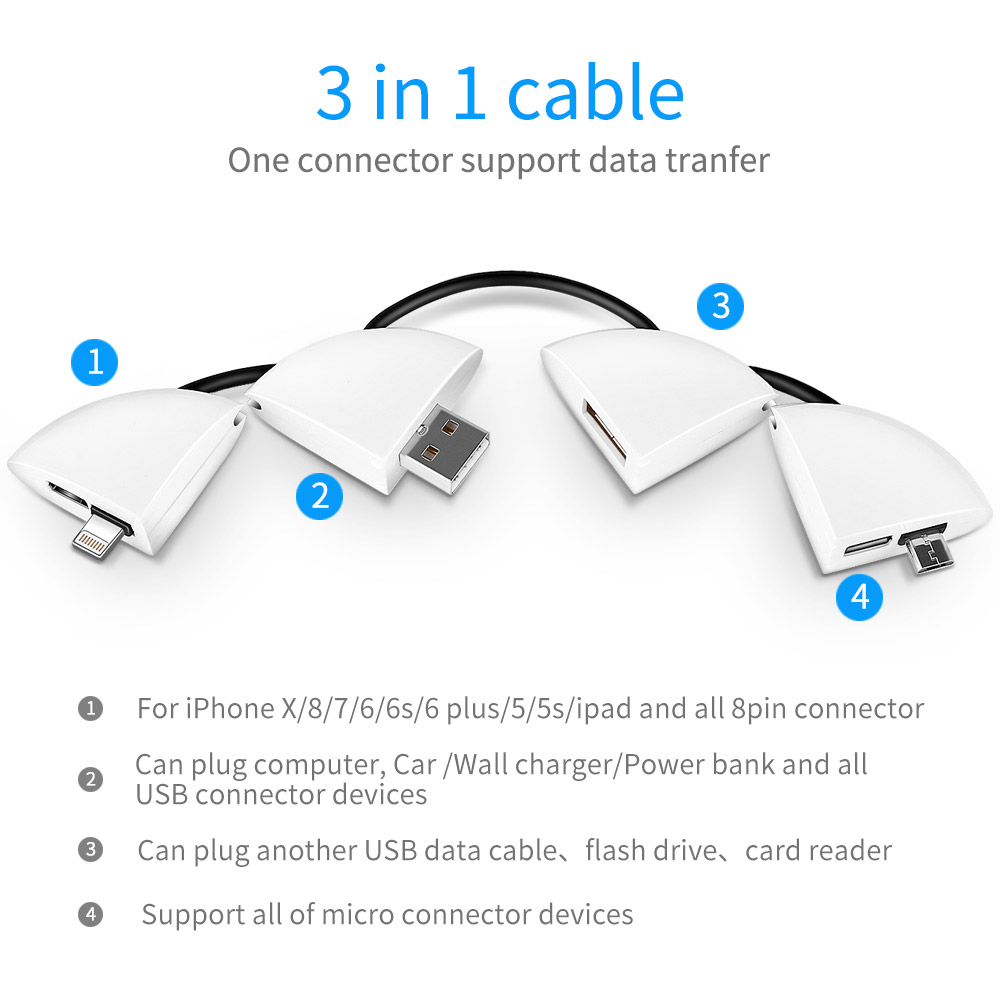 1.For iPhone X/8/7/6/6s/6 plus/5/5s/ipad and all 8 pin connector2.Can plug computer,car/wall charger/power bank and all USB connector devices3.Can plug another USB data cable、flash drive、card reader4.Support all of micro connector devices