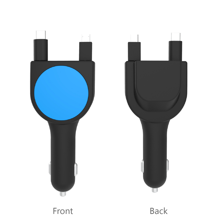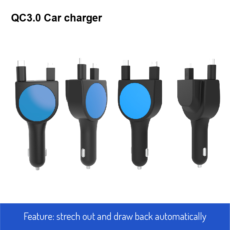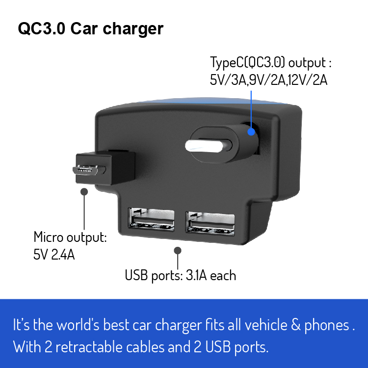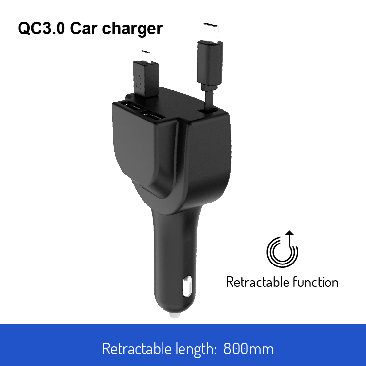 QC3.0 Car Charger with Dual Retractable Cable and 2 USB Ports G3
